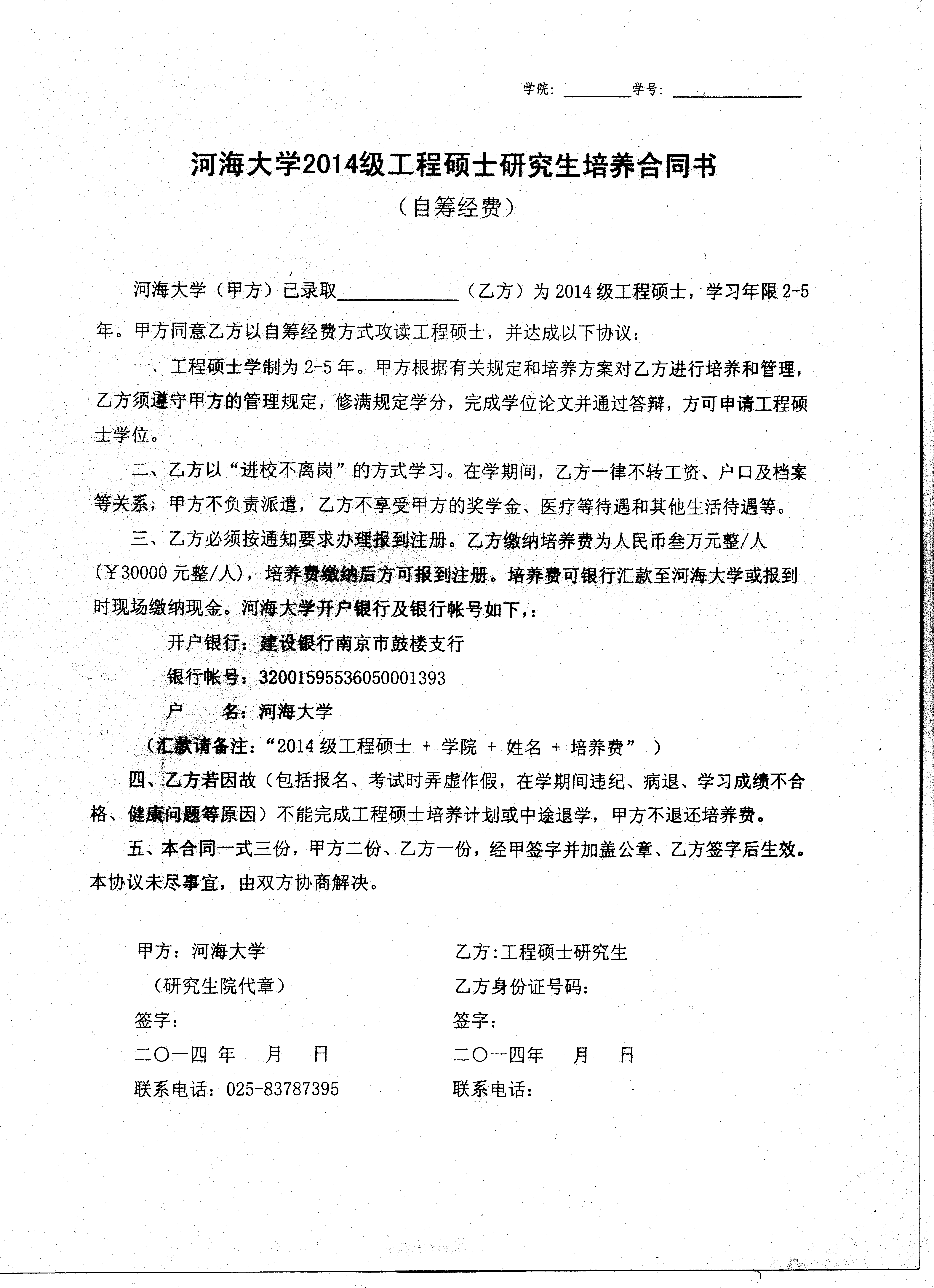 5.《ok138cn太阳集团2014级工程硕士培养合同书(自筹经费)》一式三份。注:合同书(扫描件)见附件2:工程硕士培养合同书。请事先下载签字,报到时交学院,也可以与《录取通知书》一同领取,到学院报到时当场签字;