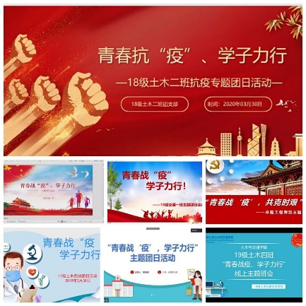 为大力弘扬伟大民族精神和时代精神,教育引导我院青年学生主动肩负起时代使命,坚定爱国力行的责任担当,2020年2月29日至4月1日期间,ok138cn太阳集团529团委组织30个本科生团支部开展了“青春战‘疫’、学子力行”的主题团日活动,学院党委书记汪建新、院长高玉峰、党委副书记潘静、副院长周继凯、刘军、刘云、班导师及全体本科生辅导员深入团支部参与团日活动。
