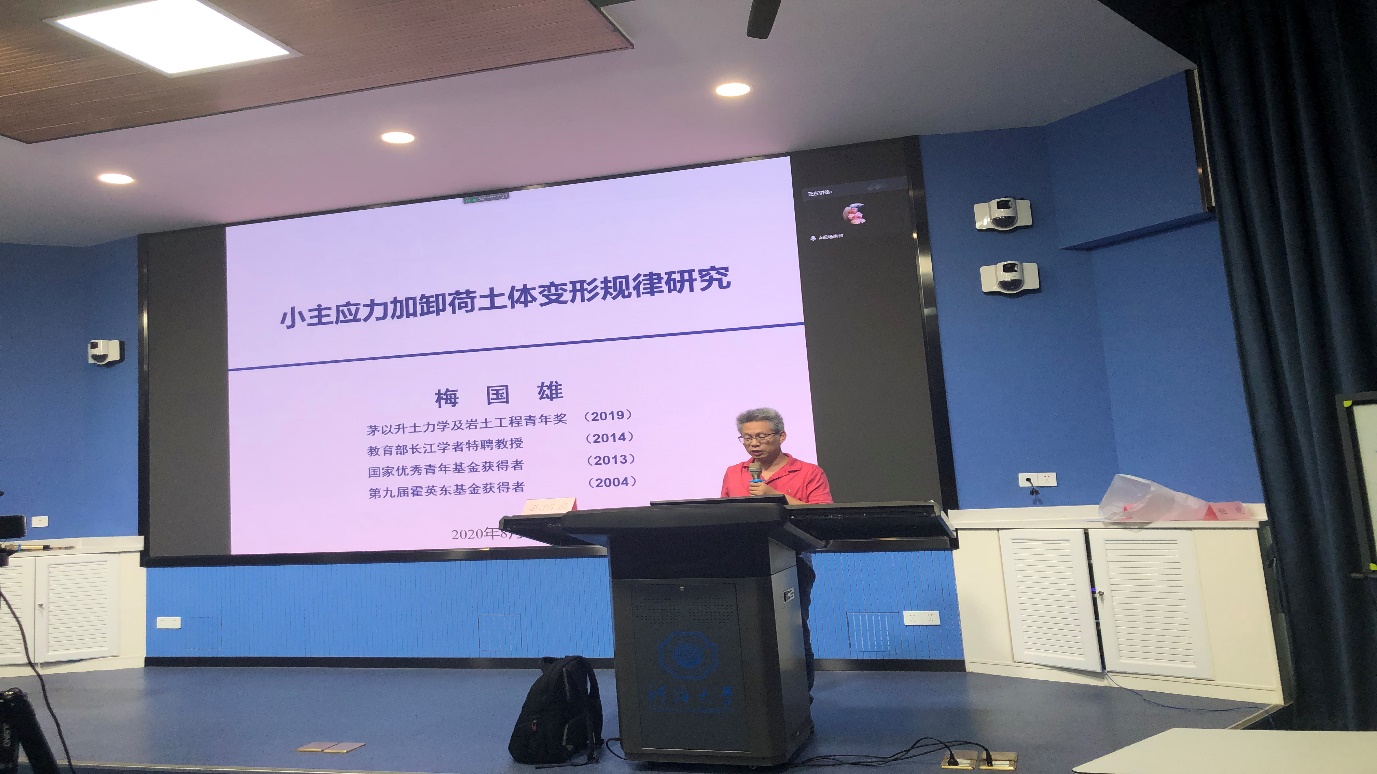 下午首场报告的主讲人是南京工业大学梅国雄教授,他的授课题目是《小主应力加卸荷土体变形规律研究》。梅教授结合自己近20年的研究成果,介绍了土压力与变形之间的经典理论关系,并重点围绕小主应力方向加卸载的工程条件,对小主应力方向加卸载土体的变形规律进行了分析,并结合实际工程阐明小主应力加卸载条件土体变形规律的工程应用价值。梅教授告诉学员们,在科研过程当中学员们要不拘泥课本,勇于提出质疑,敢于探索,永远要怀着一颗对学术追求之心,引起了线上线下学员们强烈的共鸣。