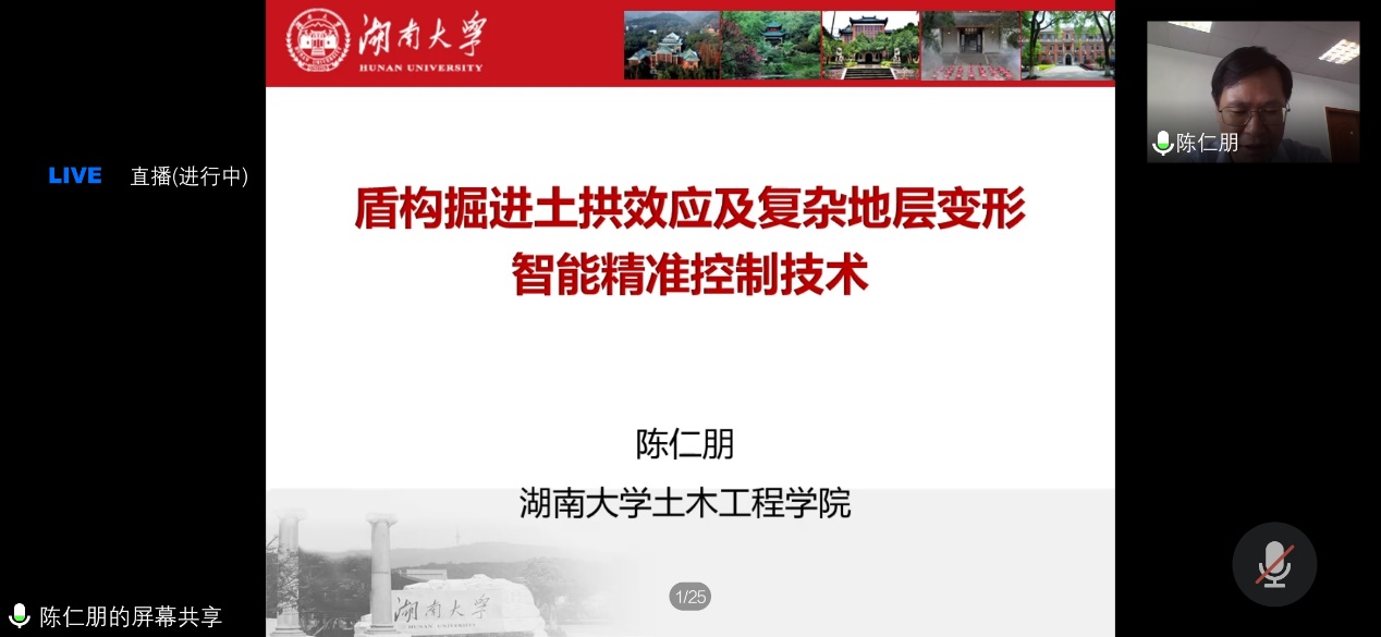 上午第二场学术报告的主讲人是湖南大学的陈仁朋教授,他的授课题目是《盾构掘进土拱效应及复杂地层变形智能精准控制技术》。陈教授分析了隧道盾构掘进的四个技术难题,引出盾构-地层动态耦合作用及地层土拱效应演化规律这个科学问题。接着从盾构掘进土拱效应和地层变形计算方法,基于地层变形精准控制的盾构掘进智能调控技术,复杂地层盾构穿越建/构筑物安全评估及保障技术三个方面介绍了研究的思路和成果,并结合深圳春风隧道下穿敏感建筑物及长沙地铁富水岩溶地层下穿历史保护建筑群等案例介绍了加固技术的工程应用。学员们和陈仁朋教授进行了热烈的互动,关于模型实验中土样选择的规则及盾构隧道判断不同地质情况下的地层沉降,从而调整盾构仓压力等问题,陈教授的精彩回答让学员们受益匪浅。