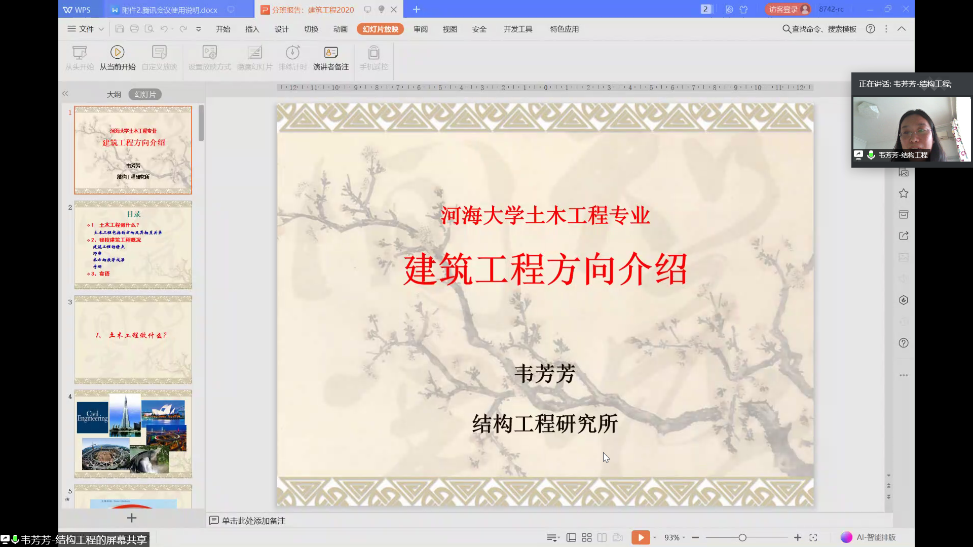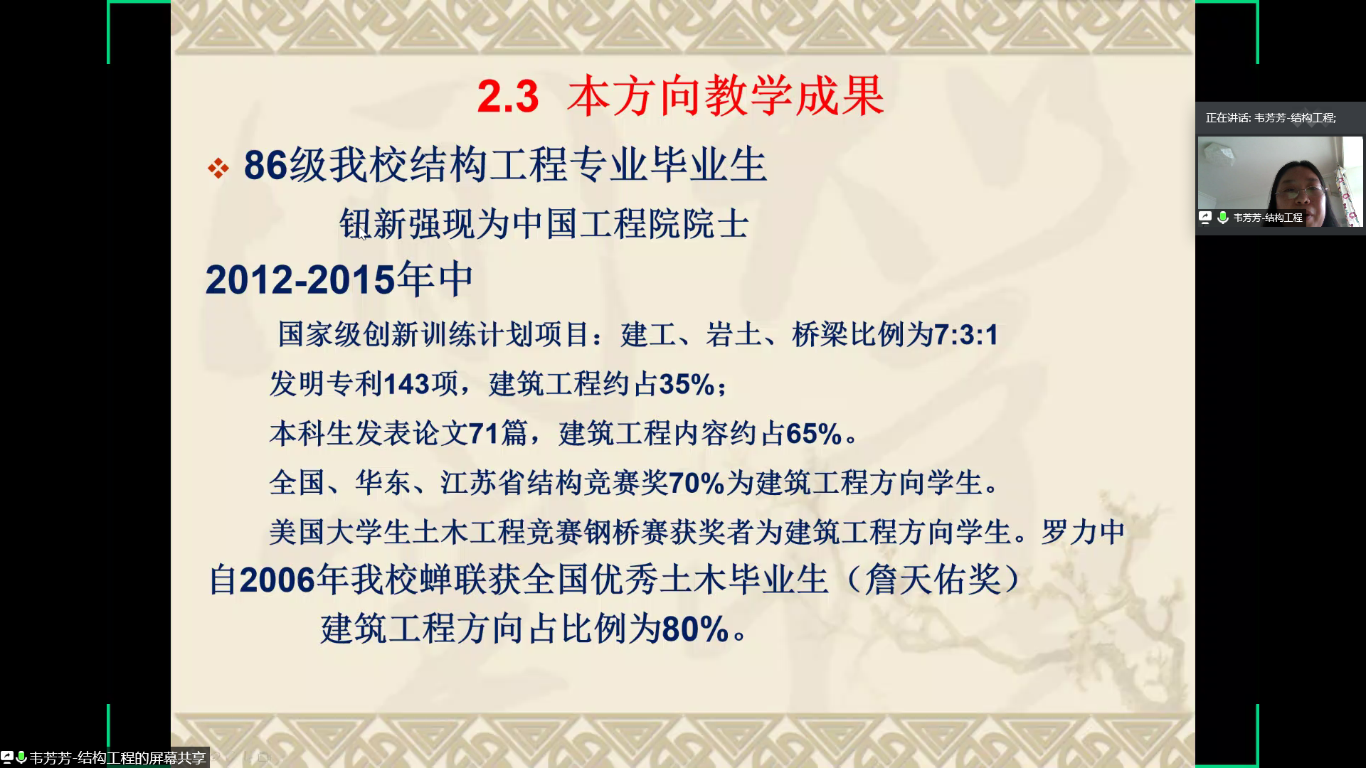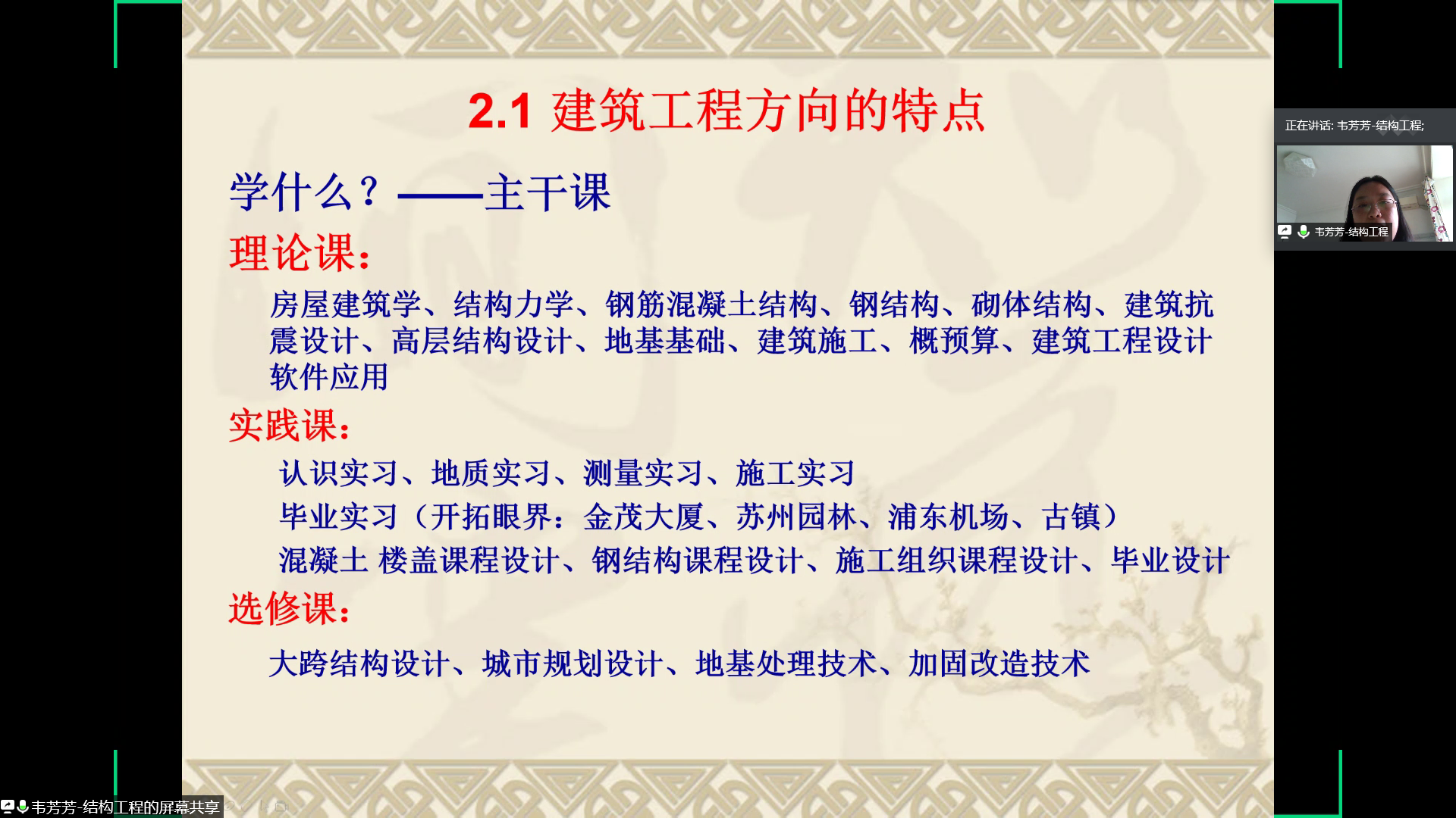 接着,韦芳芳老师在简述了土木工程专业的整体情况后对建筑工程方向进行了详细的介绍。建筑工程在本科阶段的课程主要分为理论课、实践课和选修课三部分,建筑工程方向的特点为包涵范围广、结构形式多姿多彩、工程量大、学习内容全面以及成就感强。韦芳芳老师同时介绍了建筑工程方向任课教师的基本情况、教学成果以及未来的发展方向。韦芳芳老师提到土木工程专业各方向之间是交叉、互补、融合与团结合作的关系,并鼓励同学们在专业分流时能够选择建筑工程方向,希望同学们能够成为更好的自己。