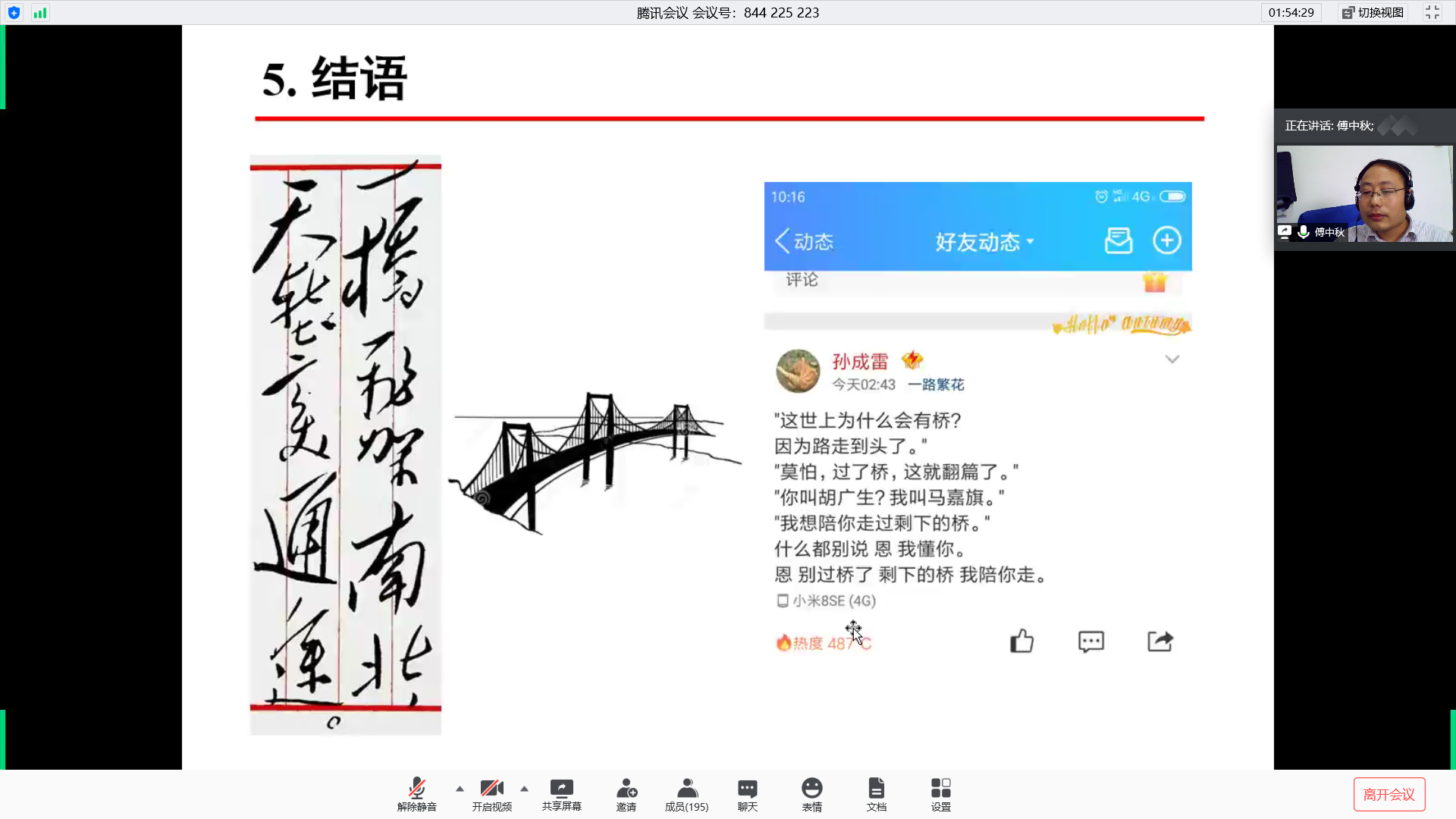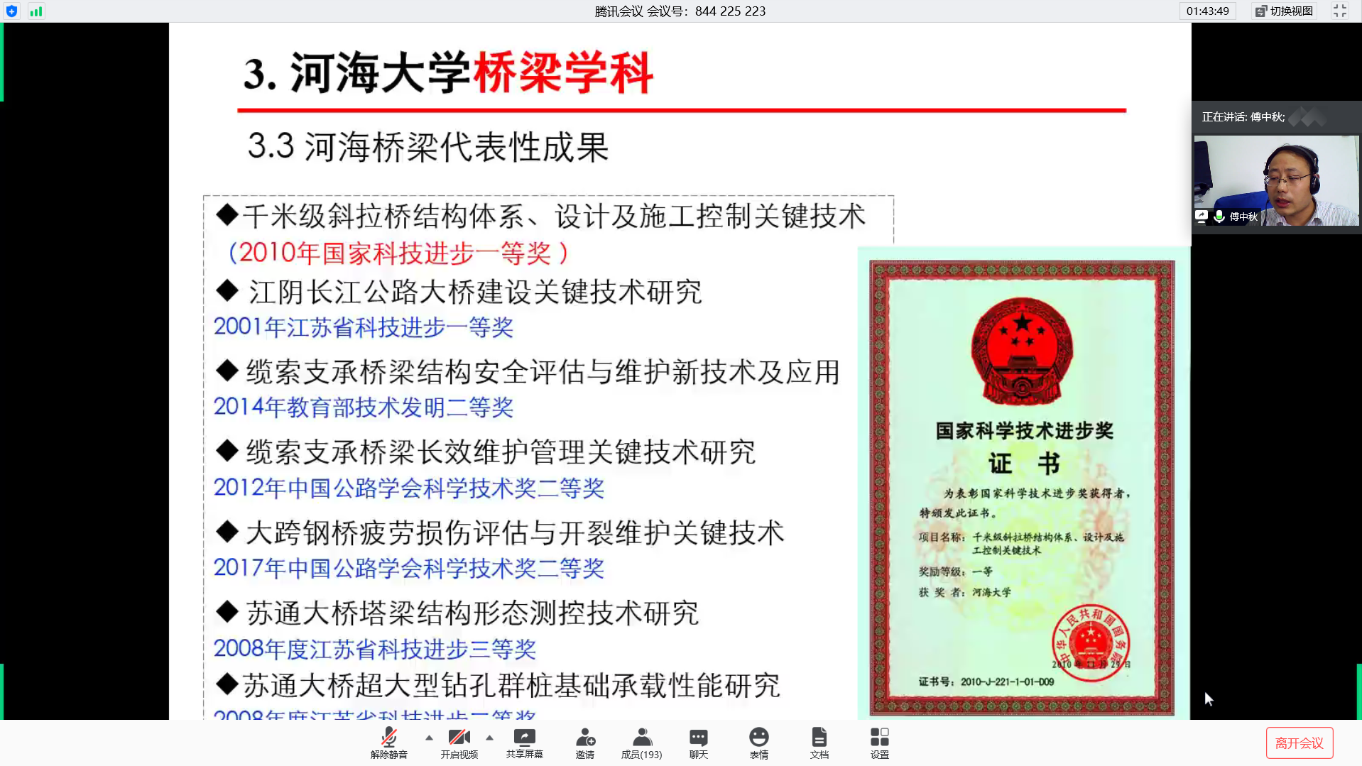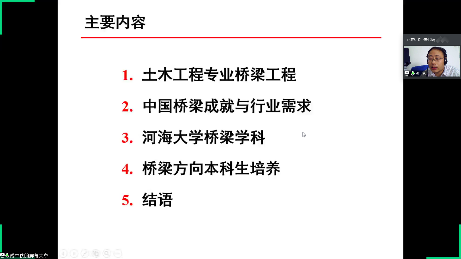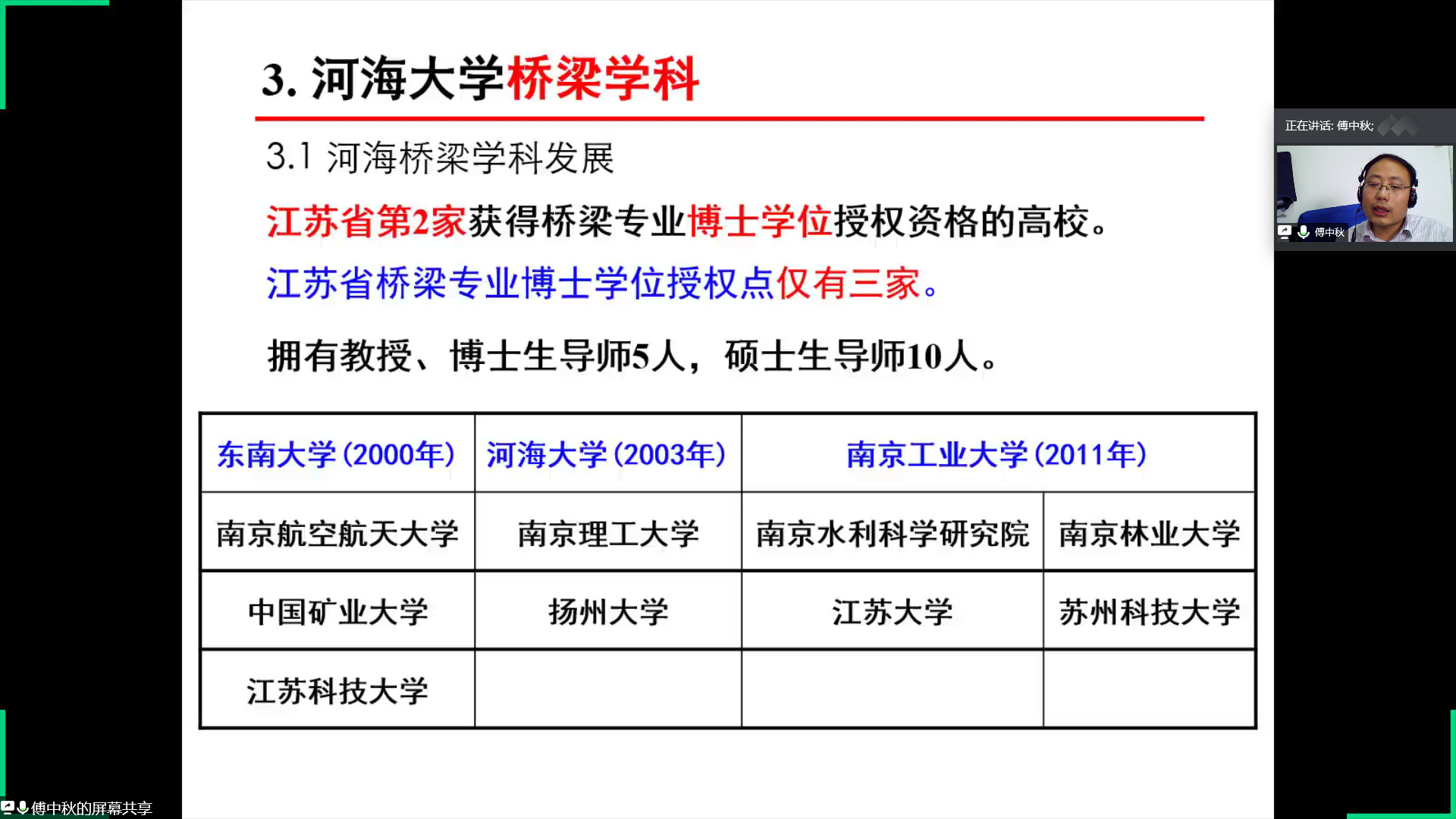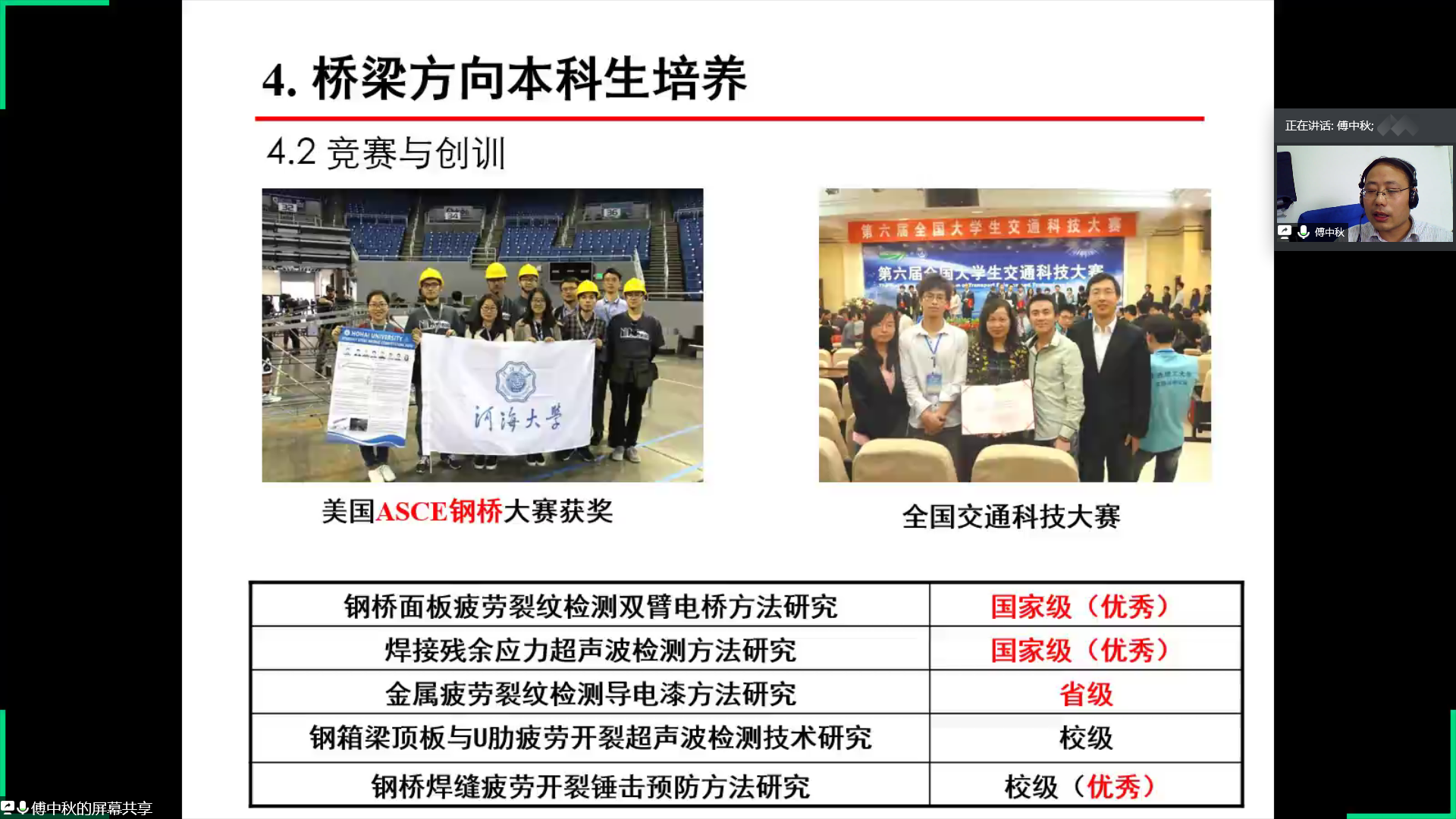 随后,傅中秋老师向同学们介绍了桥梁工程的相关内容。第一点是土木工程专业桥梁工程,包括桥梁的功能、桥梁的类型以及桥梁工程的方向。第二点是中国桥梁的成就与行业需求,傅中秋老师通过详细的数据分析向同学们展示了中国已在悬索桥建设以及桥梁里程数建设领域处于世界领先地位。第三点是ok138cn太阳集团桥梁学科,傅中秋老师细心地为同学们讲解河海桥梁学科的发展情况,并举例说明河海桥梁参与的代表性工程以及河海桥梁代表性成果。第四点是桥梁工程方向在本科阶段对学生培养模式,通过竞赛与创训、文化与传承和升学与就业等方面的指导来达到对学生的综合培养。傅中秋老师还分享了自身的学习经历并引用“一桥飞架南北,天堑变通途”来鼓励更多的同学参与到桥梁领域的学习和研究中去。