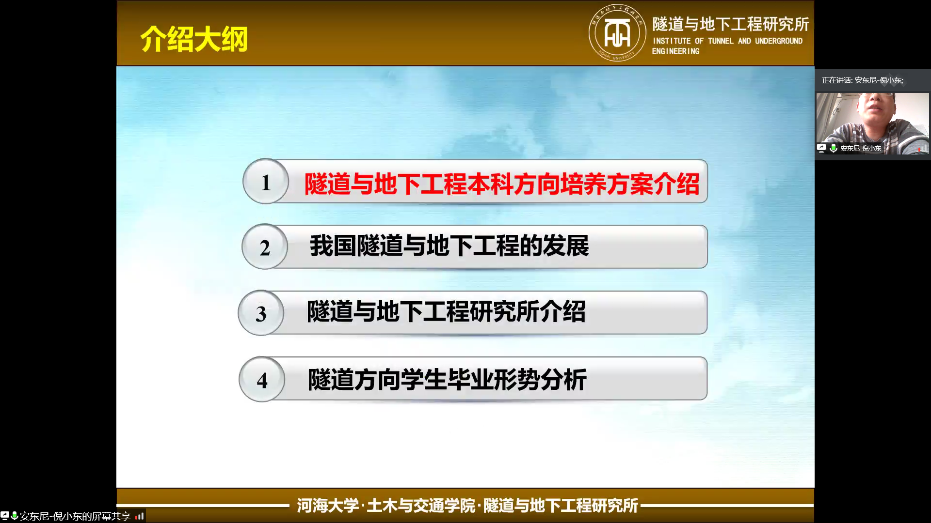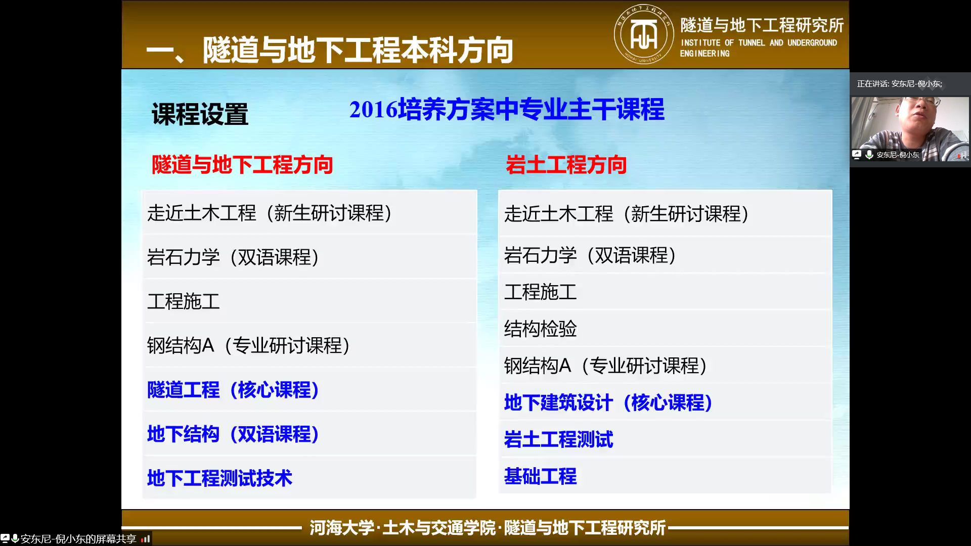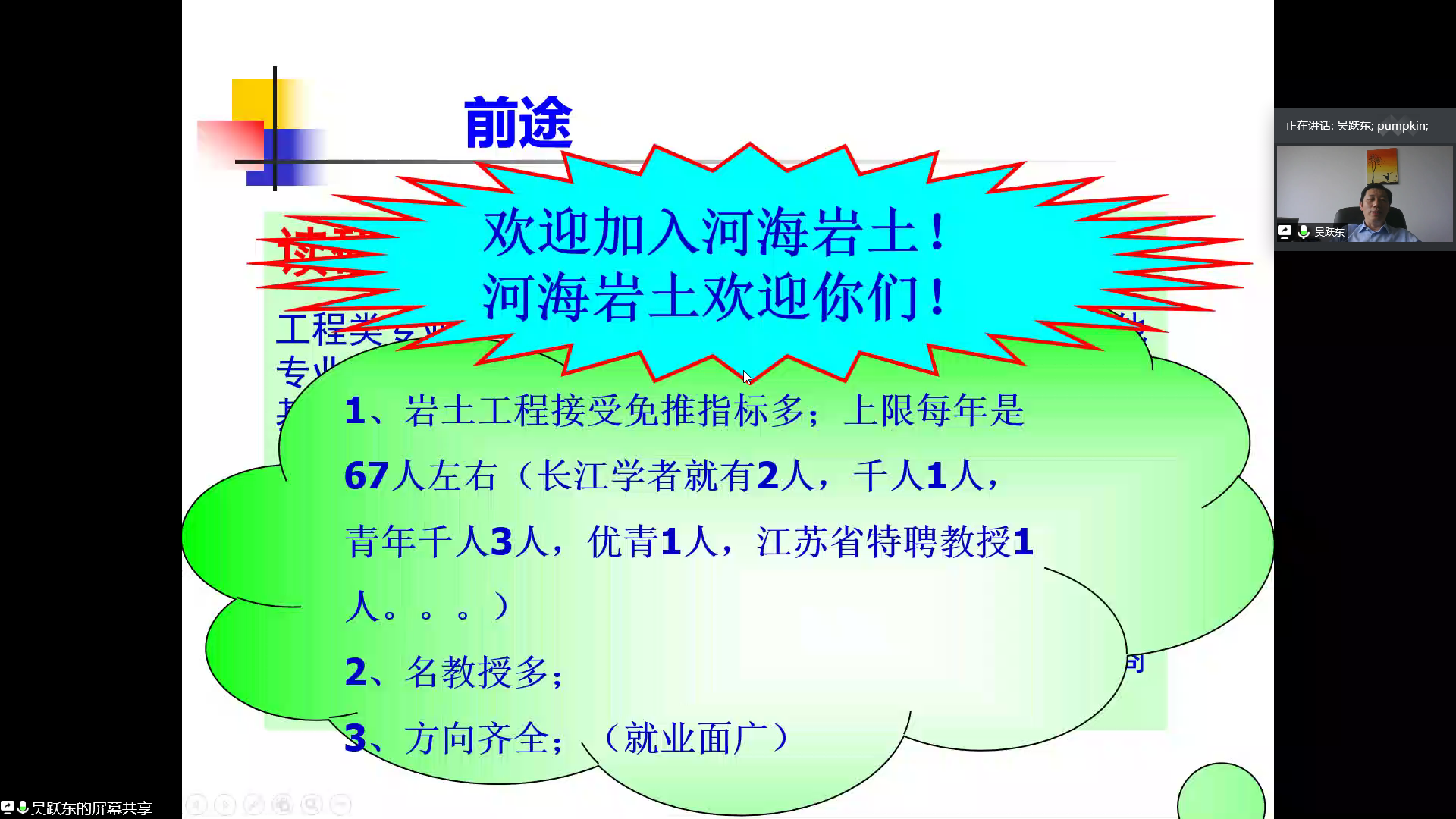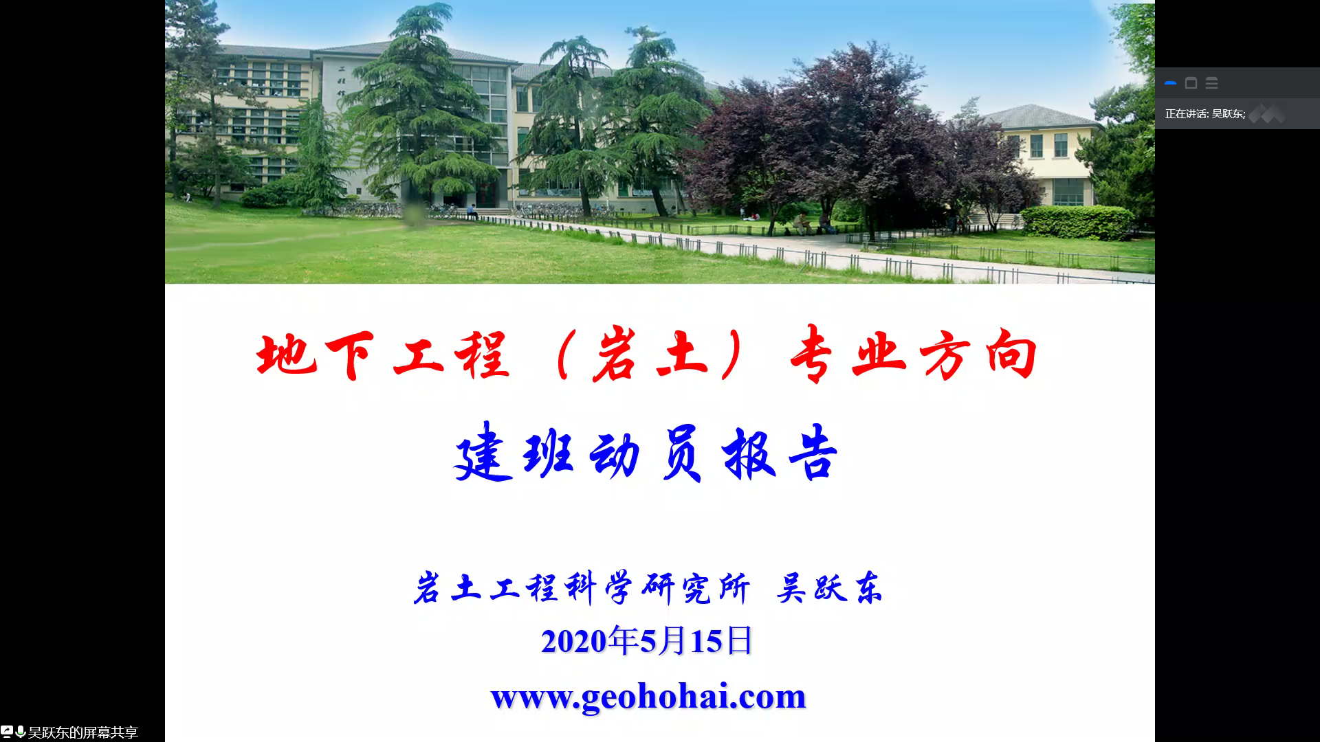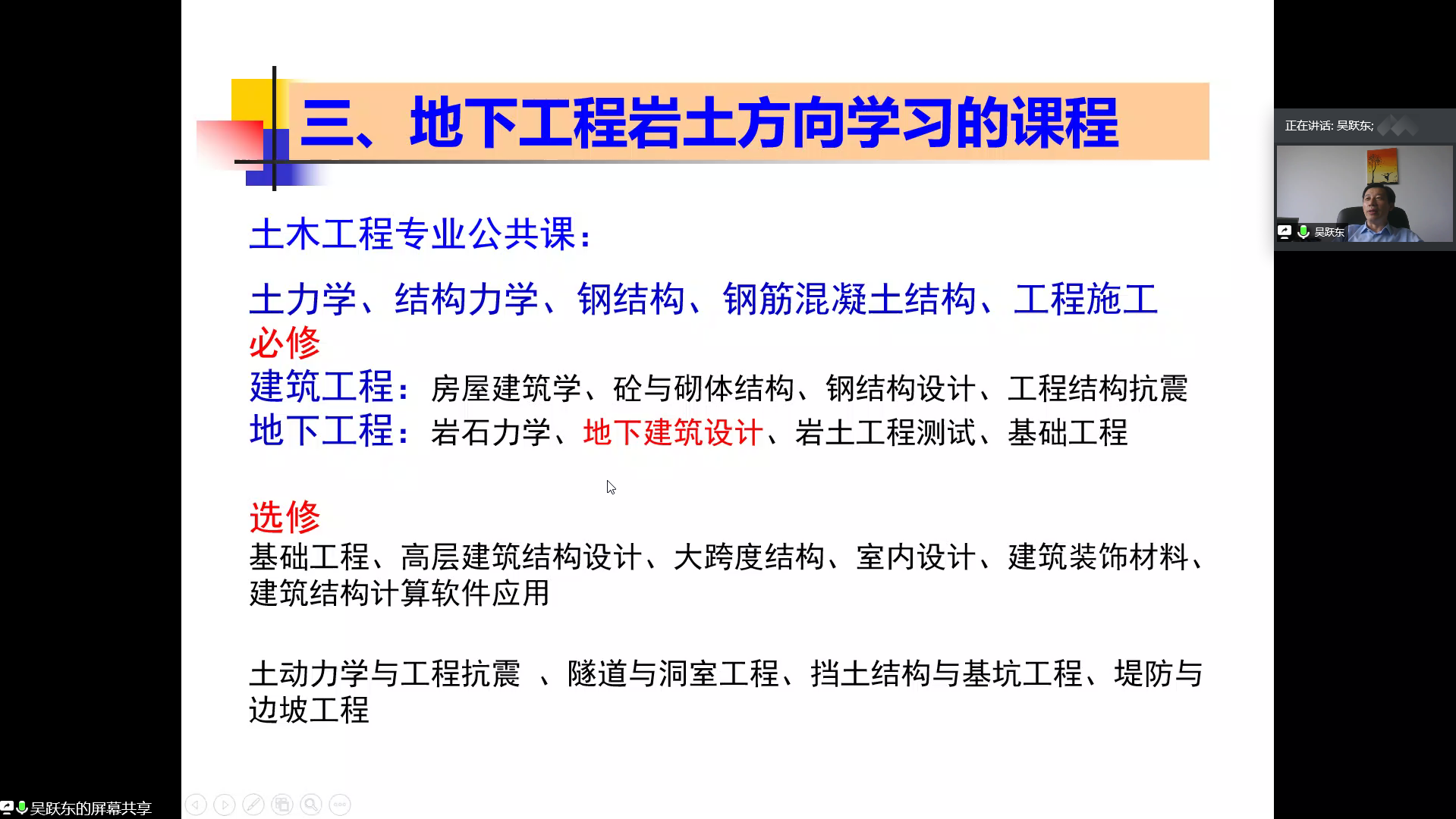 首先,吴跃东老师从地下工程方向的基本情况、地下工程学科介绍、地下工程方向本科阶段设立的课程、地下工程方向涉足的领域以及地下工程的前途与“钱途”五个方面为同学们系统地介绍了地下工程。