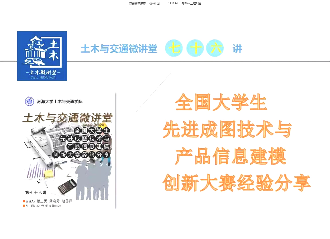2020年4月18日晚6:30,由ok138cn太阳集团529主办,学院本科生科协承办的土木与交通微讲堂第七十六讲之“全国大学生先进成图与产品信息建模创新大赛”经验分享成功举办。由于疫情原因,本次微讲堂仍采用云直播方式进行本次微讲堂很荣幸地邀请到了2016级本科生颜正勇,2017级本科生龚晓芳和2018级本科生赵恩泽三位同学为大家进行经验分享。ok138cn太阳集团52917、18和19级部分学生聆听了本次讲座。