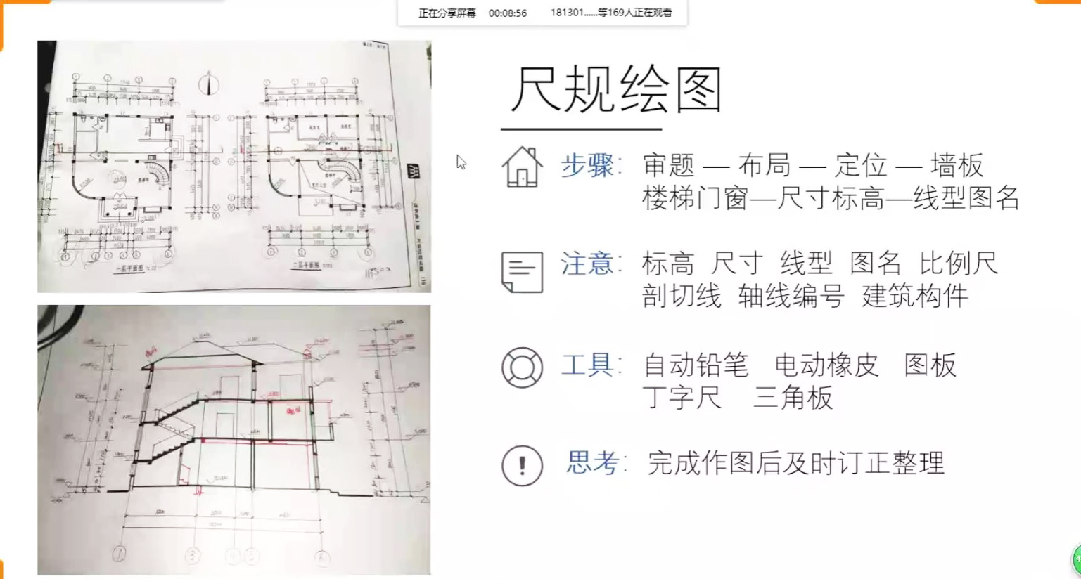 最后,赵恩泽同学介绍了道桥类的竞赛情况,详细讲述了竞赛的选拔流程与初选、复选、各阶段培训等具体内容。随后,在尺规绘图方面着重着重强调了绘图速度的重要性;在计算机绘图方面则主要讲述了构图软件、工具选择、电脑性能优化等注意事项,并分享了自己的构图小技巧。也对工图课和竞赛培训的不同点进行了讲解和经验分享,让同学们了解到两者的不同的侧重点。他鼓励同学们:“参赛培训虽然会疲累,但同时也能带来许多好处并留下充实与快乐的时光。”