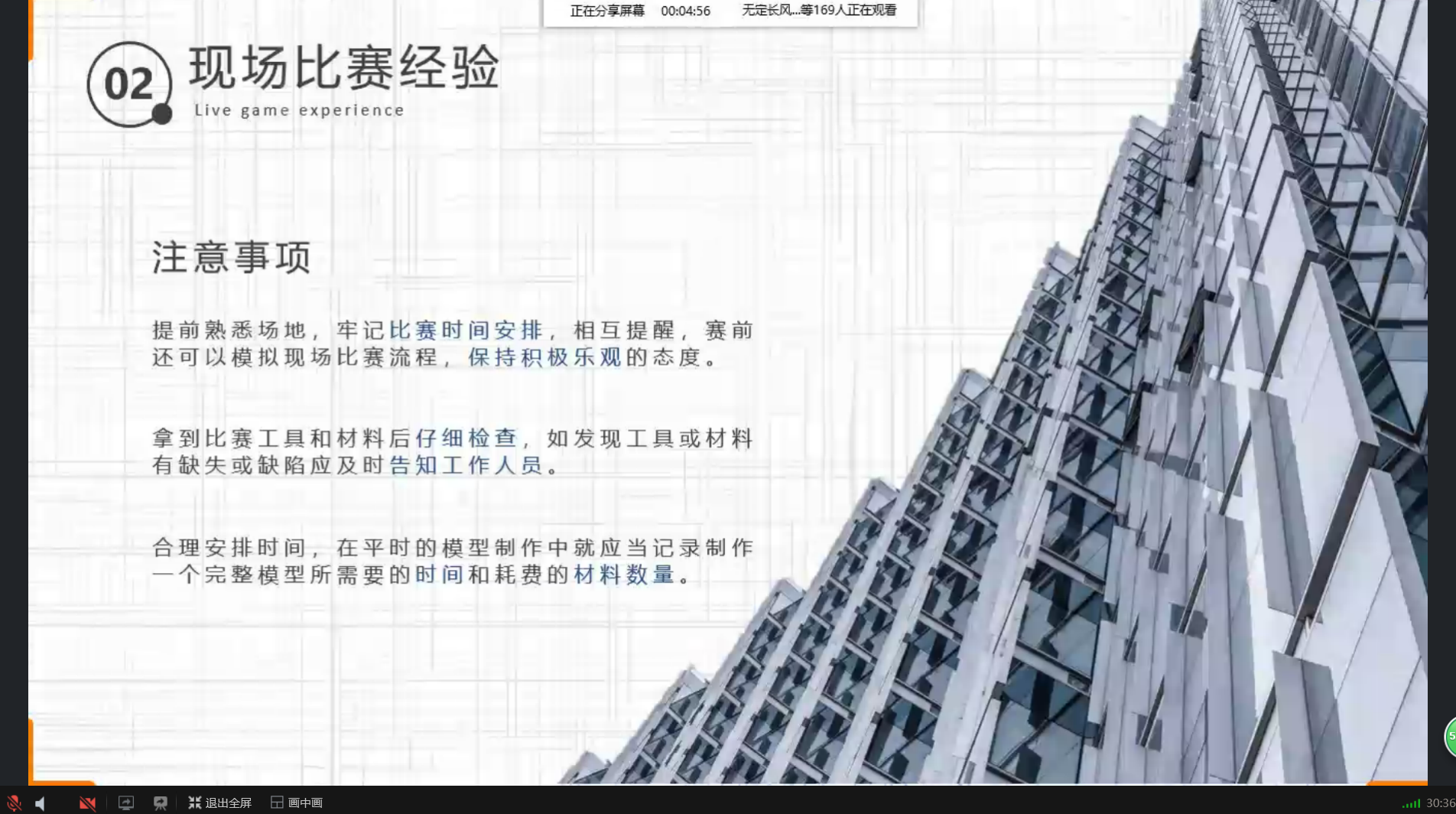 接着,王昊康同学向大家分享了自己参加“全国大学生结构设计竞赛”的比赛经验。他先介绍了赛前准备工作的相关内容,告诉同学们要仔细研读赛题从而明确模型设计的任务与方向,按照理论准备、选型、设计、计算四个步骤,循序渐进完成任务。紧接着,王昊康同学讲述了自己参与现场比赛的过程,结合自身参赛经历总结出了做好准备、调整状态、细心谨慎、随机应变这四点要求。然后他又分享了自己对于模型制作方面的一些经验和感悟,向同学们讲解了模型制作过程中的技巧,并说明学习模型制作是一个日积月累的过程,以此来鼓励大家即使在制作模型中遇到问题也不要轻言放弃。最后他发表了对于此次结构设计竞赛赛题的个人见解,并讲解了计算书的撰写要求和比赛流程,使同学们对于结构竞赛有了更加全面丰富的了解。