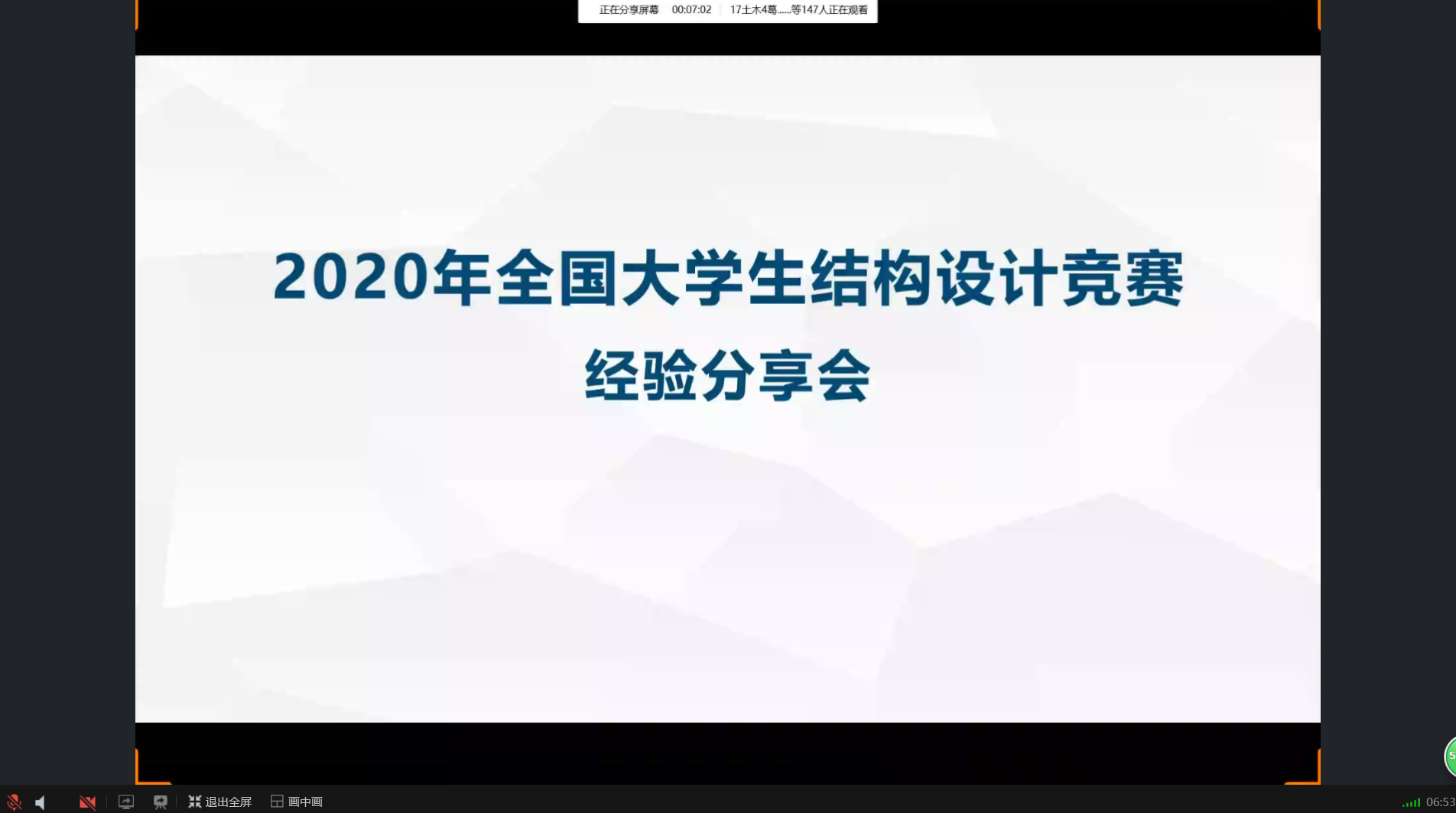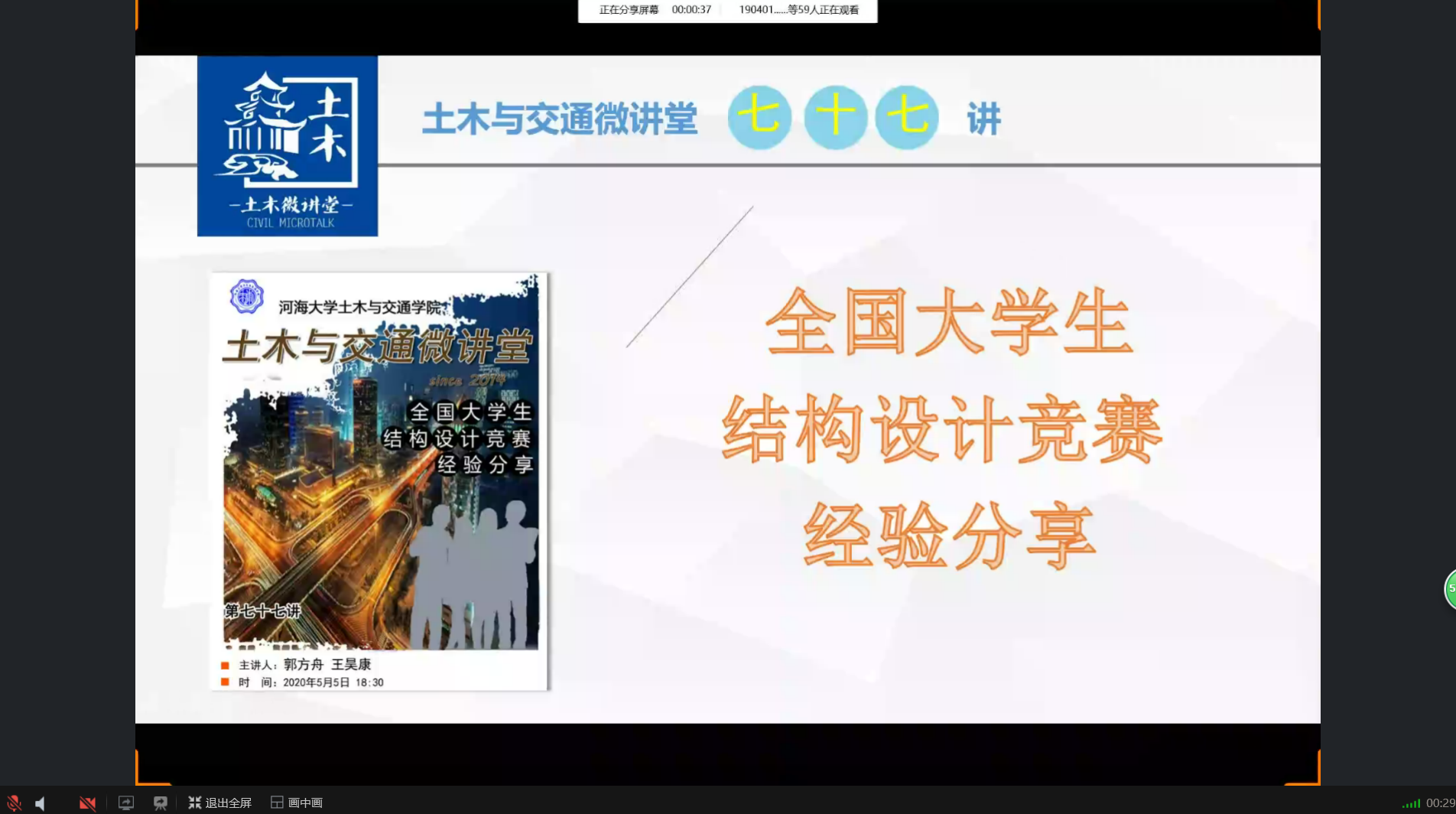 2020年5月5日18:30,由ok138cn太阳集团529主办,学院本科生科协承办的土木与交通微讲堂第七十七讲之“全国大学生结构设计竞赛经验分享会”以线上直播的方式成功举办。本次微讲堂邀请到了2017级土木工程结构方向本科生郭方舟和王昊康同学为大家带来经验分享。ok138cn太阳集团52917、18和19级部分学生聆听了本次讲座。