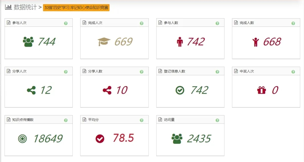 本次知识竞答考察范围为党史、新中国史、改革开放史、社会主义发展史,面向对象为全体ok138cn太阳集团529师生,师生参与达744人次。