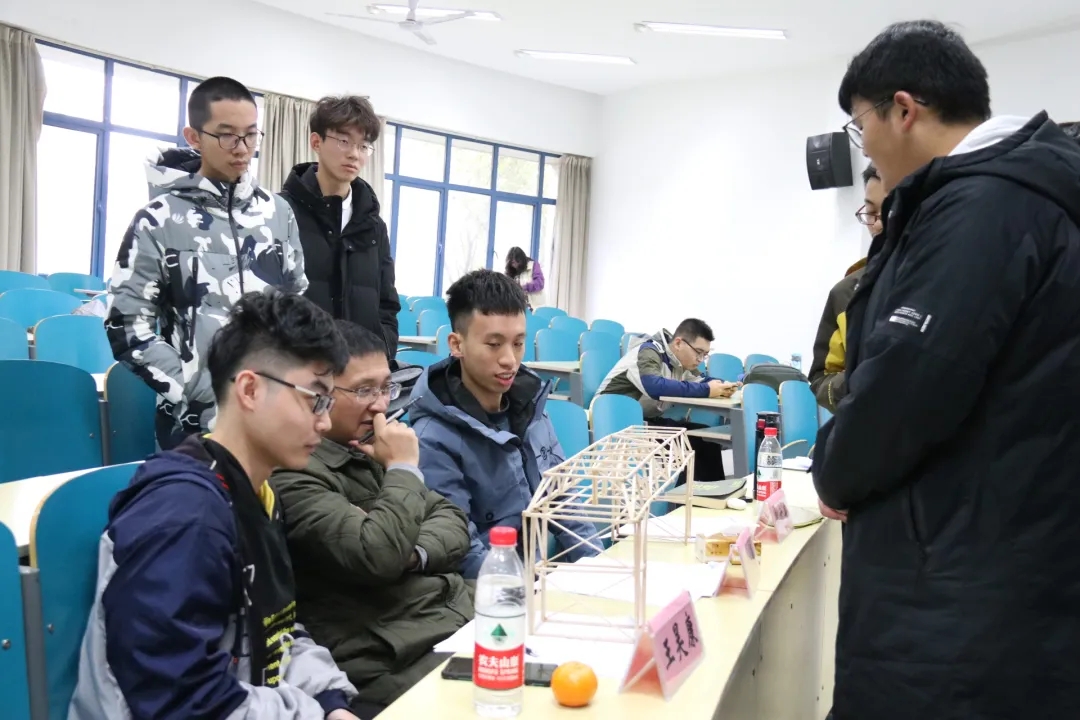 首先,各小组依次将参赛作品交给评委查看并简述小组设计理念及作品的构造依据。评委细心地指出模型尚存在的问题,向参赛选手分析其模型的优势与不足,并从模型结构的合理性与创新性,制作质量与美观性等方面进行点评打分。