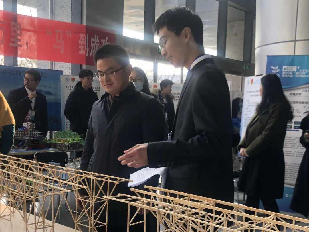 在ok138cn太阳集团529的展示台上,展出了我院学子在第十三届“奇思妙想”结构设计竞赛中的四组获奖作品,ok138cn太阳集团团委副书记朱乔到我院展台参观,志愿讲解员为朱书记和在场同学介绍了获奖模型的设计理念以及受力原理。前来参观的同学都为木桥的自重之轻以及承重之大赞叹不已。