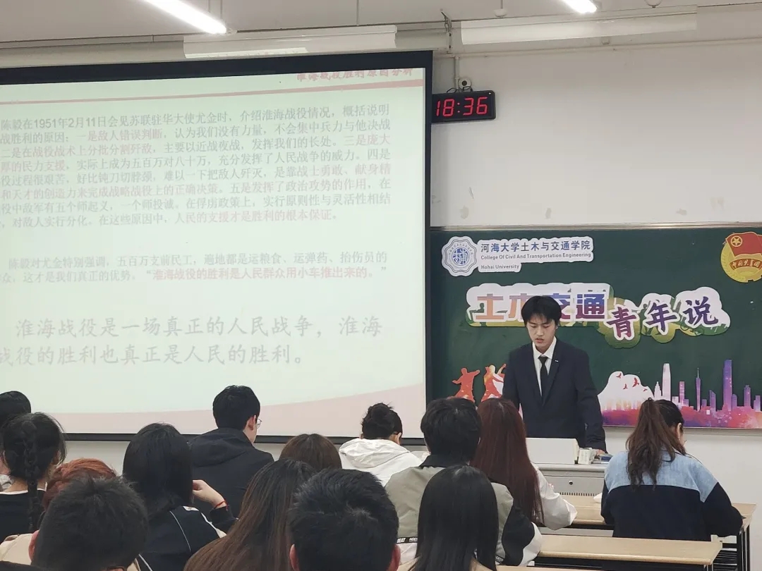 首先,主讲人王若琛同学结合自己参观淮海战役纪念馆的经历,从淮海战役的背景、经过、战役胜利的原因、以及战役胜利的意义与价值等方面向大家详细介绍了淮海战役。牢记历史,是为了开创未来;不忘战争,是为了维护和平。作为新时代的青年我们应该铭记历史,大力弘扬红色精神,让红色记忆在当今依然熠熠生辉。