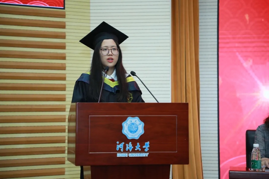 毕业生代表卞怡同学发言,首先表达了对学院老师最真挚的感谢以及对大学生活的不舍,卞怡同学以理论力学的学习为引述,讲述了自己在学习力学的过程中领悟到了学习的意义,找到人生的追求并为此不懈努力的美丽青春。她代表全体2021届毕业生作出承诺,一定会继续发扬学校和学院的优良传统和精神,学以致用,在未来的工作、学习中充分施展才华,实现人生梦想。