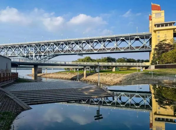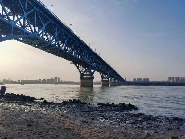 和煦的阳光使整个金陵城恍若春景,我们来到了南京长江大桥。在这段旅程中,通过观察铁路引桥纵立面和底面,可以看到很明显的简支结构和T型梁的截面形式;在玻璃栈道入口前的驻足,可以看到钢桁梁结构的公铁路两用桥全貌:银白的大桥在湛蓝天色和朱红桥头堡中盈满光泽,这些都与书上的一幅幅示意图重合起来,并赋予了色彩和动态的张力,鲜明的展现在我眼前。在日暮之时,我们走上了公路引桥,在行走中感受这座大桥的呼吸与脉搏,感受与桥同在的穿行人流,切实体会到它不仅跨越天堑,辅助经济发展,还融入了人们的日常生活中,变成了城市的符号。