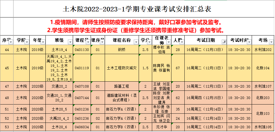 土木院2022-2023-1学期专业课考试安排(第16周)