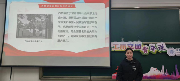 之后,秦子晗同学为大家讲述了西柏坡革命旧址的故事,突出了西柏坡以其独特的贡献彪炳于中国革命史册,竖起一座不朽的历史丰碑的重要意义。