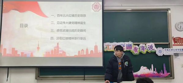 首先,何阳同学为大家讲述了北京大学红楼的故事,带领大家见证了五四运动时期青年一代的灿烂青春,并倡导同学们学习先辈身上所展现出的中华民族自强不息、奋斗前行的精神。