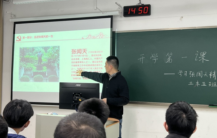 接着,“开学第一课”暨学习张闻天精神的主题班会在水利馆105举办。班会从“学习张闻天精神”、“集体荣誉感”、“保持心理健康”、“防范电信诈骗”四个部分展开。第一部分由刘鑫老师带领大家学习张闻天精神。刘鑫老师首先播放视频短片,让大家对张闻天同志的一生有了形象的了解,接着刘鑫老师带领大家回顾张闻天同志一生的光辉事迹,以张闻天同志无论经历怎样的挫折,却始终未放弃自己的人生理想为例告诉同学们在学习和生活的道路上不要怕犯错,不随波逐流,坚持自己的理想的道理。