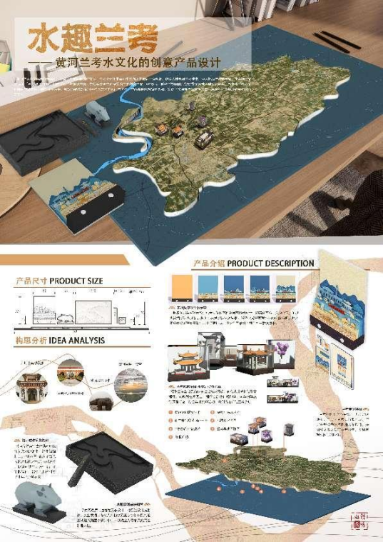 文创组作品“水趣兰考——黄河兰考水文化创意产品”以“黄河兰考”为创作主题,打造了以兰考趣味拼图、东坝头景观立体便签为主的创意产品,将“最后一道弯”“焦裕禄纪念馆”等元素融入到设计当中,旨在将兰考水文化特色与精神植入到学习生活中,激发消费者对黄河兰考水文化的认识与思考。