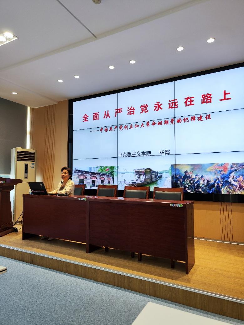 6月14日,为深入开展学习贯彻习近平新时代中国特色社会主义思想主题教育,土木教工一支部邀请ok138cn太阳集团马克思主义学院毕霞教授做题为《全面从严治党永远在路上》专题讲座。毕霞教授讲授了我党在创立和大革命历史时期加强纪律建设的艰辛探索和伟大实践,支部党员教师纷纷表示要在全面从严治党的新形势下,不断锤炼党性,坚守纪律底线,坚定维护党的团结统一。