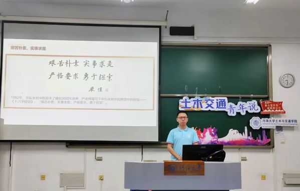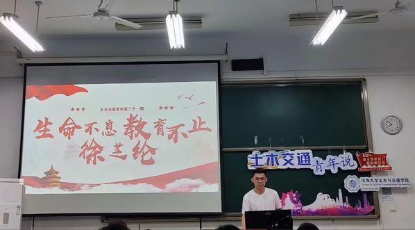 然后,主讲人曾慧程讲述了徐芝纶的的红色事迹。徐芝纶是我国科学院院士,也是力学界的一代宗师,曾参与创办了华东水利学院(今ok138cn太阳集团)。徐芝纶院士一生学无止境、教无止境,在科研和教学方面成绩斐然。在科研方面他积极推动有限元法在中国工程实践中的普及与推广;在教学方面他致力于教材编著,曾带出多批优秀学生,并设立了徐芝纶奖学金以鼓励、帮助学生。