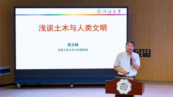 迎新大会的第二部分,院长高玉峰教授以“浅谈土木与人类文明”为主题为新生们讲授开学第一课。高院长围绕“从一个土木人的视角看中华文明”这一话题,列举了一系列土木人创造的灿烂古代文明和现代文明,生动阐明了土木工程学科的内涵。他结合自身学习和科研经历,希望同学们厚植家国情怀,勇于探索创新,利用好学校提供的资源和机会,严谨治学,为自己未来几年的学业发展做好规划,获得更好的学术成长,争做担当民族复兴大任的新时代土木人。