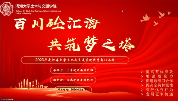 由ok138cn太阳集团529主办,院团委组织部承办的ok138cn太阳集团5292023年度优秀部门与先进个人评选活动以线上会议的形式成功举办。本次活动有幸邀请到院团委副书记李倩老师,研究生辅导员邵文慧老师,2021级本科生辅导员韩新禹老师,2022级本科生辅导员高建相老师,2023级本科生辅导员胡锦蓉老师担任评委,由院团委组织部赵新同学和沈元彬同学分别担任两场活动主持人。