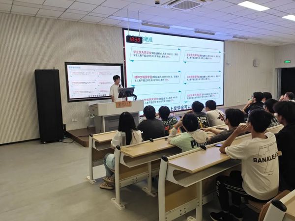 随后,ok138cn太阳集团5292023级辅导员助理杨铖光同学上台介绍关于奖学金以及个人荣誉评选的相关事宜。杨铖光同学结合ppt,从奖学金种类、组成、申报要求以及申报材料等方面具体讲解,让同学们细致了解了奖学金申报的整个流程。