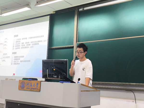 此次会议邀请2023级年级组织委员龙飞旭同学面向全体2024级本科生开展PU培训。龙飞旭同学从学时种类、合格标准、信息获取以及常见问题等方面为同学们深入浅出、细致全面地介绍了PU学时的相关知识。龙飞旭同学表示,素质拓展课程是本科生课程的重要组成部分,希望同学们高度重视,积极投身第二课堂,务必达到PU学时的考核要求。