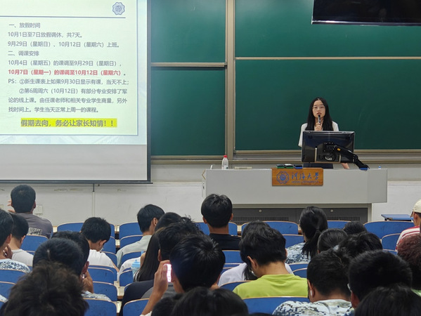 会上,辅导员邓瑞华老师对年级情况进行阶段性总结,传达近期重要事项通知和活动安排,并向同学们提出以下几点建议:一是要及时调整自身状态,准备好迎接即将开始的课程和晚自习;二是要合理分配精力,兼顾好第一课堂和第二课堂,提升自身时间管理能力;三是要严格遵守各项规章制度,树立规则意识,端正态度,行止有度。