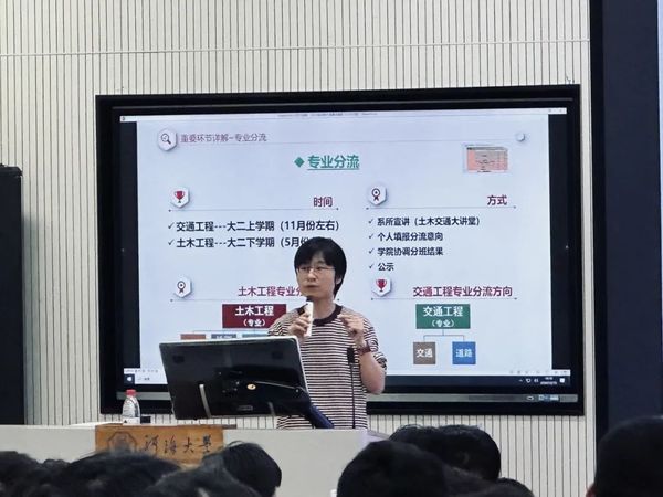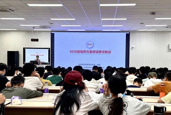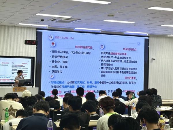 第四,陈鹏老师结合土木院2024年秋学期与春学期的具体数据分析讲解常规学业环节时间节点以及选课、考试、补考、重修、学业预警、学籍处理、绩点等重要环节。期间,陈鹏老师为同学们着重讲解了绩点的主要用途以及提高绩点的具体办法,并分析非推优绩点和推优绩点的区别和两种绩点的具体应用场景,帮助同学们学会在不同场景中平均学分绩点的计算方法。
