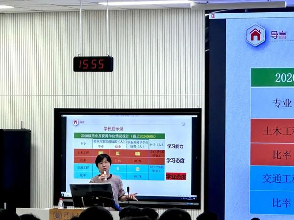 首先,陈鹏老师展示了2020级毕业及学位获得情况,从学习能力、学习态度和学业态度三个角度分析现象产生原因,其中着重强调了端正学业态度、增强学业学分修读意识的重要性。