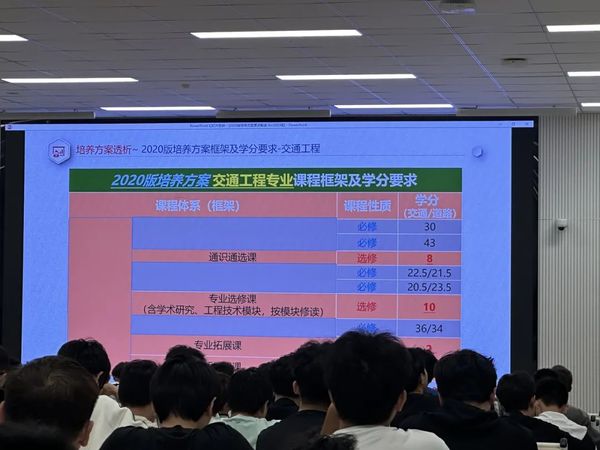第二,陈鹏老师为同学们科普了培养方案中的“大格局、小框架、学分制和周期性修订”,重点分析了“小框架”和“学分制”的具体含义。陈鹏老师依据2020版本的培养方案和学分要求,分专业解析了通识通选课、专业拓展课和专业选修课三大类课程的具体学分组成,总结了毕业证所需要件。