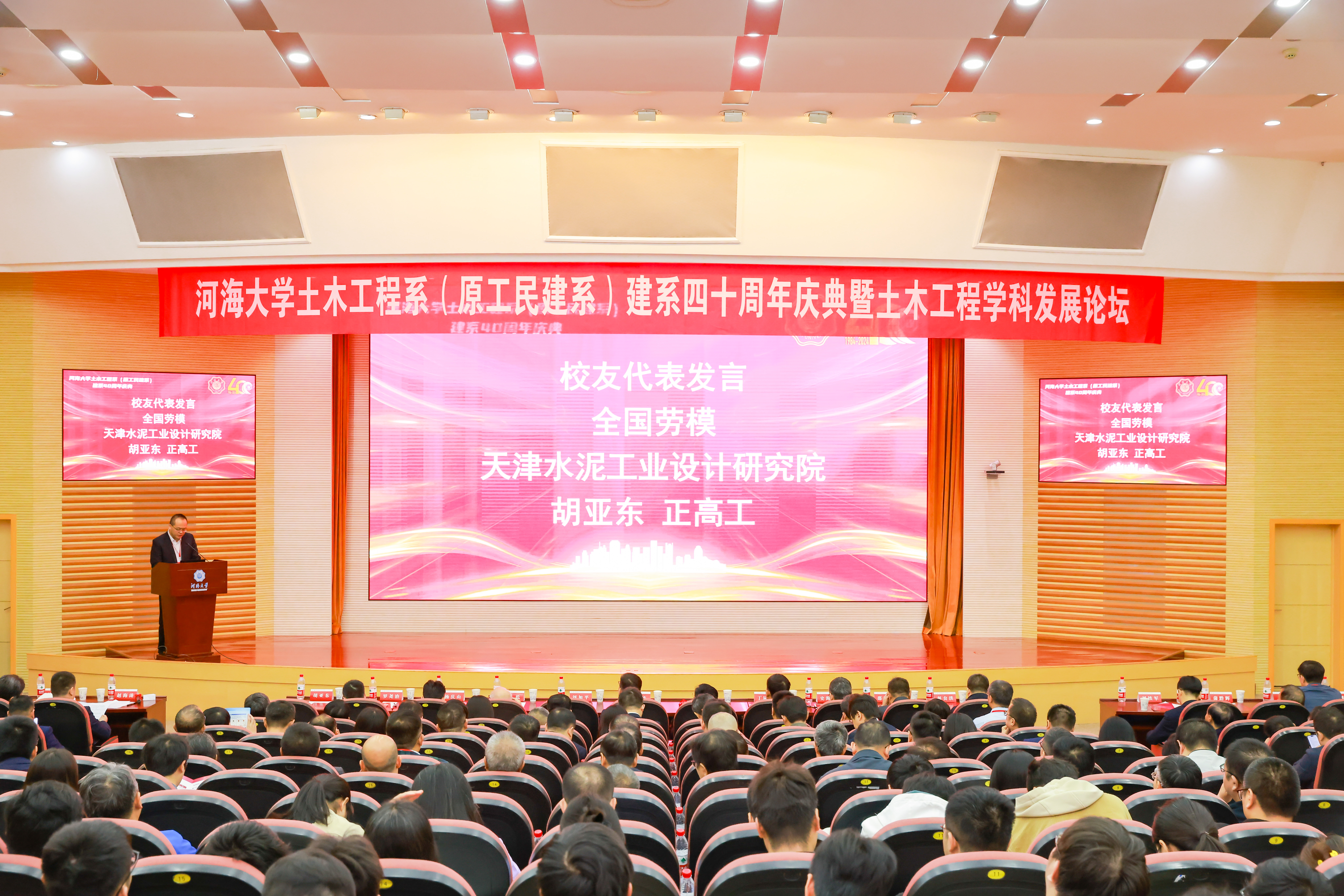 大会宣读了杰出校友代表周学文的贺信。兄弟院校代表、浙江大学建筑工程学院院长罗尧治教授上台致辞,向ok138cn太阳集团土木系成立四十周年致以最热烈的祝贺。