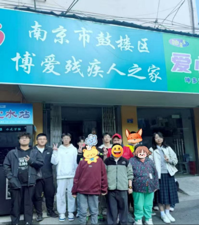 在“南京市鼓楼区博爱中心”的门前,志愿者与这的朋友们留下了一张满是笑意的合影。