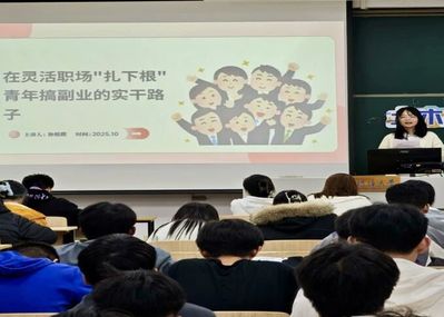 之后,主讲人孙悦熙以“在灵活职场‘扎下根’:青年搞副业的实干路径”为主题,讲述了当代青年立足自身兴趣与技能,探寻职业发展新路径的故事。为了进一步论证这一观点,她列举了相关案例:山东 00 后卢庆欢凭借微缩模型还原老房子,将个人兴趣发展成拥有 30 人的团队,年营业额达数百万元;返乡青年俞科弟为“次坞打面”开启直播,推出冷链礼盒,使传统美食借助副业模式成功出圈。这些案例启发同学们要立足自身兴趣与技能发掘副业潜力,将个人热爱转化为可持续的实践项目,同时追求副业与主业的协同发展,形成“兴趣-实践-成长”的良性循环。